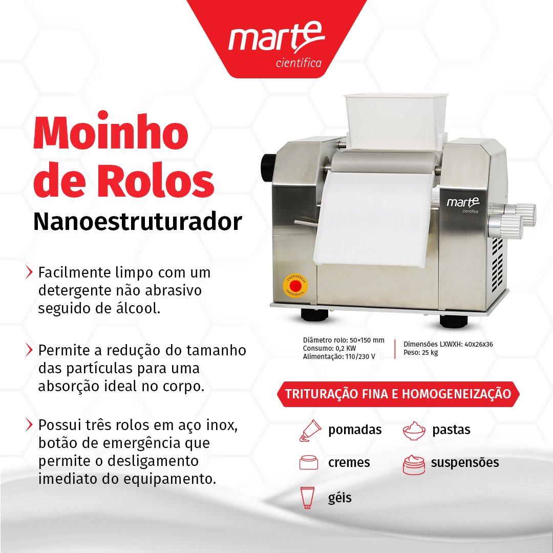 A Marte Científica tem o prazer de anunciar o lançamento do Moinho de Rolos Nanoestruturado, um equipamento de última geração concebido para atender às necessidades de trituração fina e homogeneização de pomadas, cremes, pastas, géis e suspensões. Com uma trajetória de eficiência comprovada na aplicação magistral, este moinho é essencial para a produção de produtos de alta qualidade.