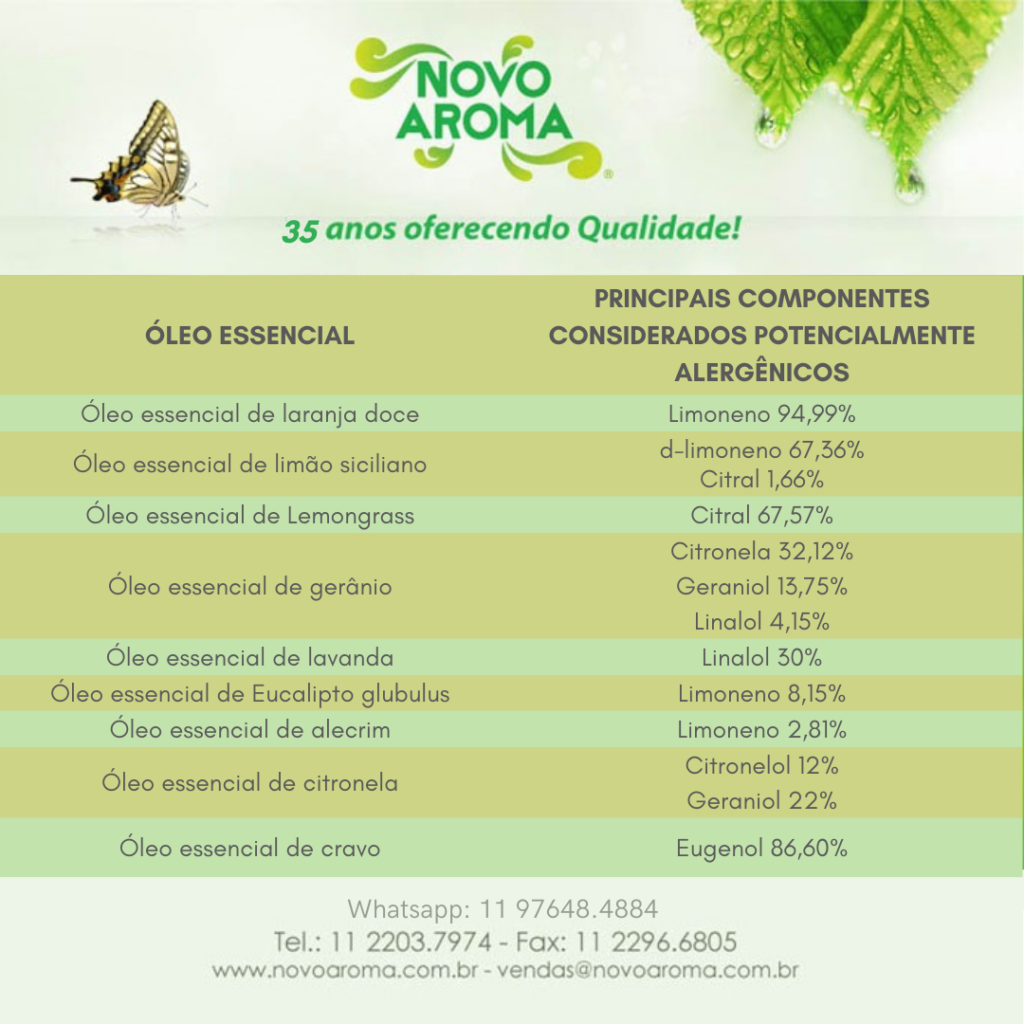 Os óleos essenciais são produtos considerados naturais. Em sua composição os óleos essenciais podem conter algumas substâncias que foram identificadas como causa importante de reações alérgicas de contato entre os consumidores sensíveis a fragrâncias e aromas as quais configuram na lista de matérias primas potencialmente alergênicas.