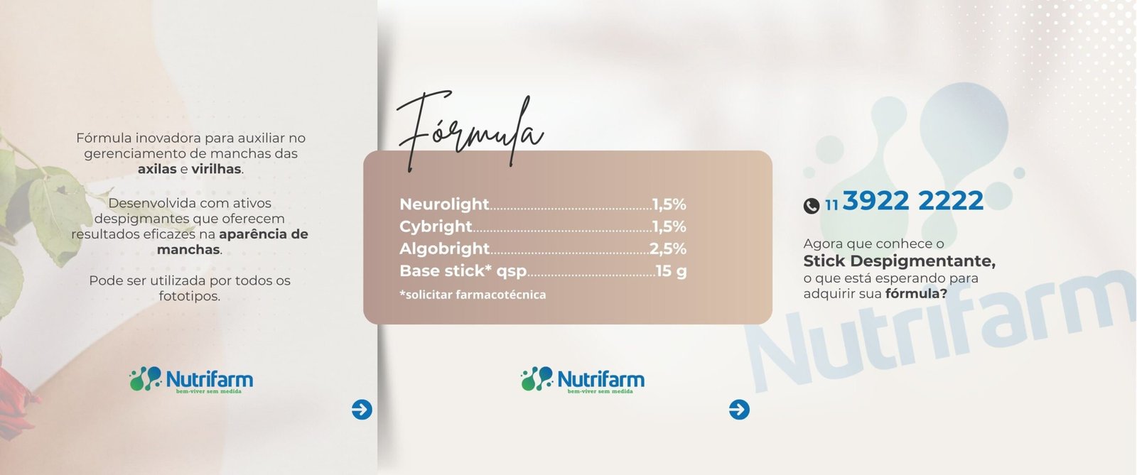 O Stick Íntimo da Nutrifarm é uma fórmula exclusiva para o gerenciamento de manchas nas axilas e virilhas, combinando três ativos despigmentantes de alta eficácia: